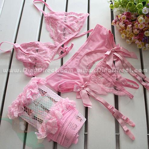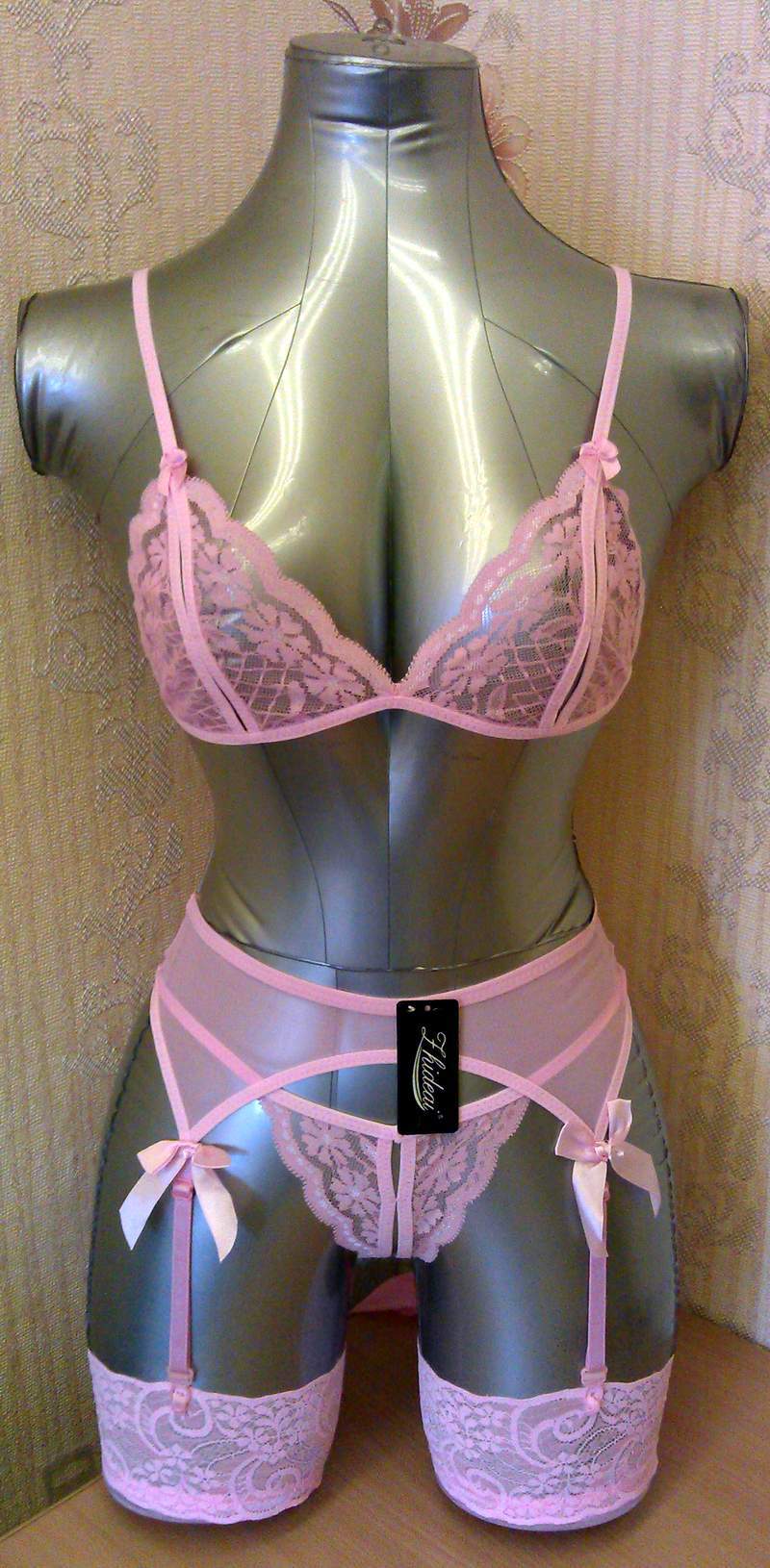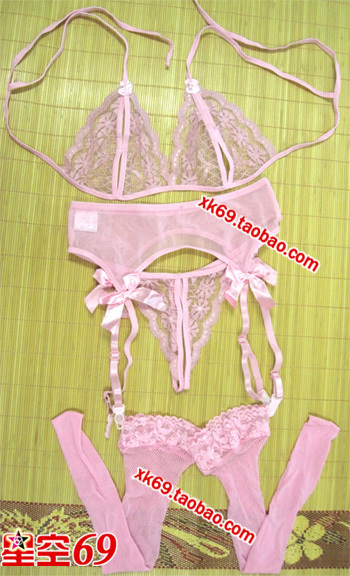 Кружевной комплект включает: трусики-пояс с подвязками для чулок, топ с разрезами, чулки.