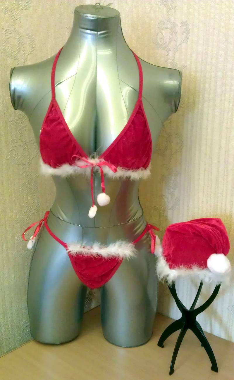 Раздельный новогодний комплект из мягкого бархатного материала соблазнит любого мужчину. Все элементы комплекта украшены перьями и меховыми шариками.