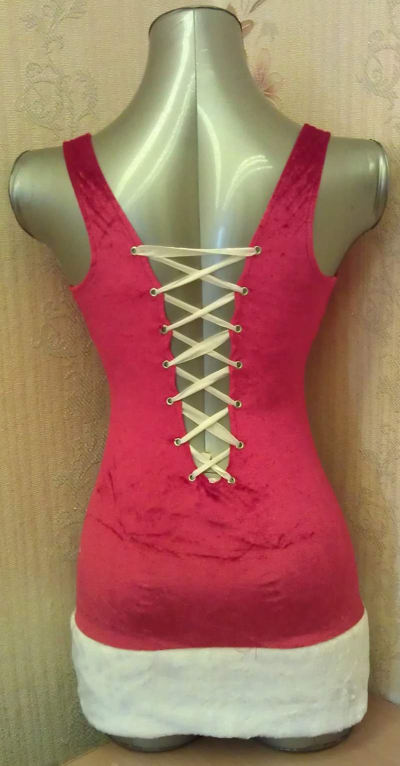 Элегантное платье с глубоким вырезом, подчеркивающим грудь, снизу украшено мехом, спереди белым бантиком, а сзади шнуровкой.
