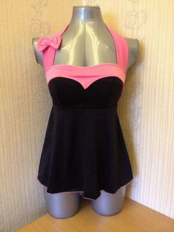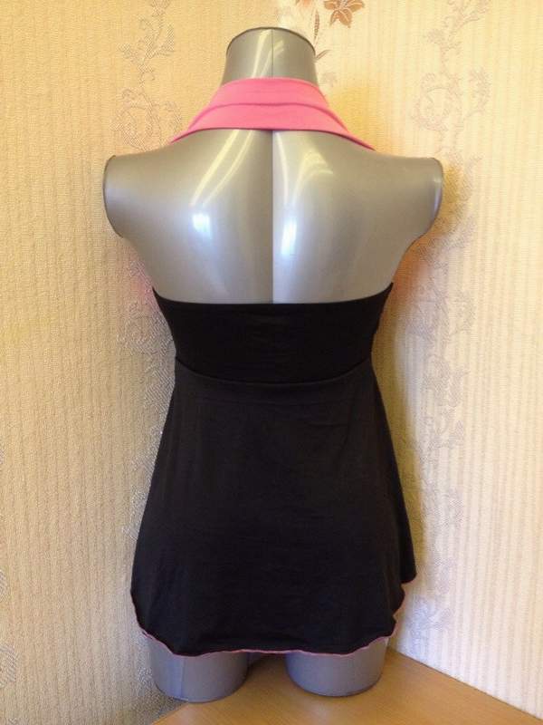 Черная укороченная сорочка из плотного трикотажа и поролоновыми чашесками на лифе. Спина полуоткрыта благодаря бретели через шею с кокетливым бантиком. Трусики в комплекте.