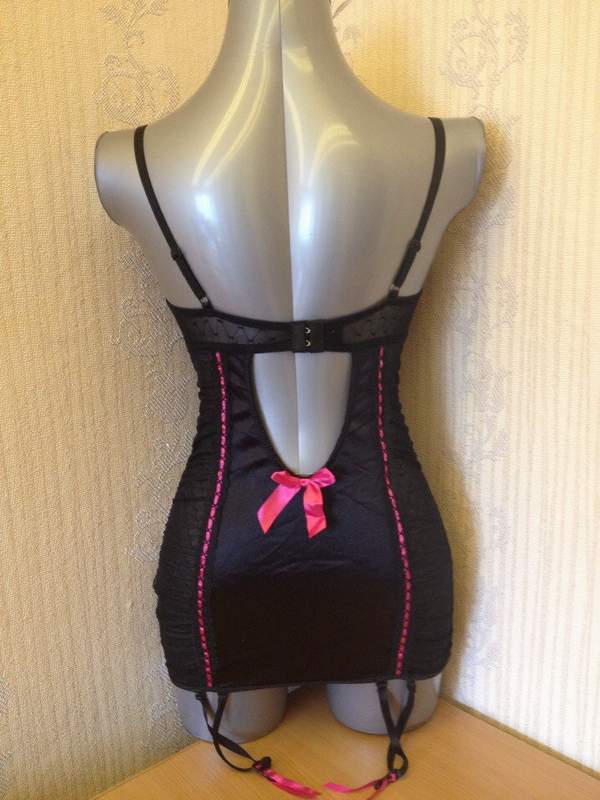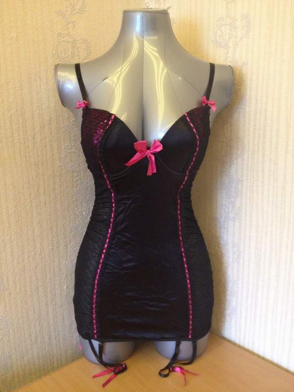 Сорочка на тонких бретельках выполненный в черно - розовой гамме, по бокам сборка. Чашечки на косточках хорошо держат грудь.