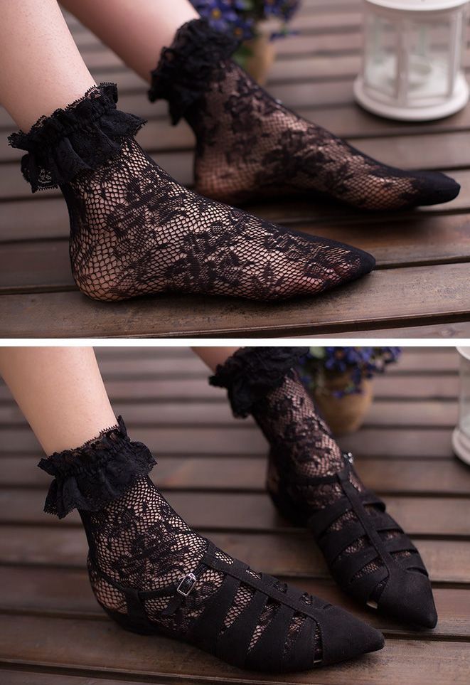 Черные носочки выполнены в технике чулочной вязки с цветочным узором. Верхний край украшен мягким кружевом.